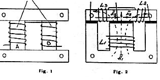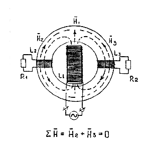 Fig. 2 shows a similar version of bidirectional operation mode. The coil L1 is loaded with the AC generator. The coils L2 and L3 create two opposite magnetic fluxes H2 and H3 Total effect of creation of power in loads is equal to zero.