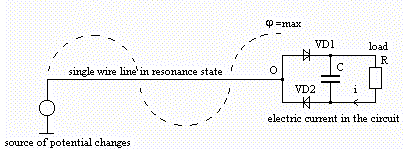 By this way electric power can be extracted from the single-wire line and the TRC theory predict some changes in local space-time. There are known technical methods to get it. On Fig.1 you see the Tesla's single-wire system